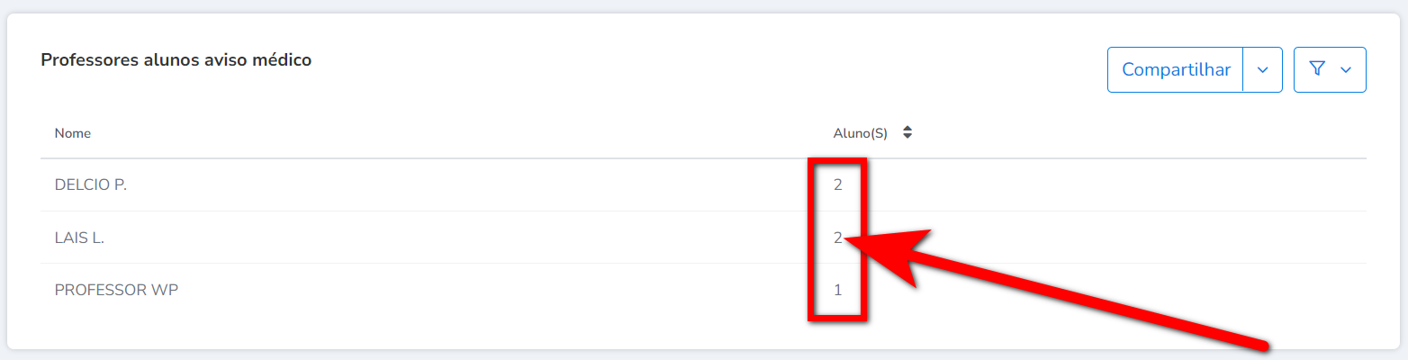 3. Serão apresentados todos os alunos que possuem o aviso médico lançado agrupados por professor.
