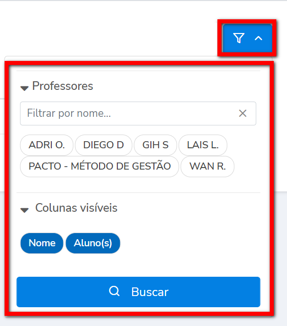 1. Consegue filtrar as informações clicando no ícone de filtro. Pode filtrar por professor em específico e escolher quais colunas deseja visualizar as informações;