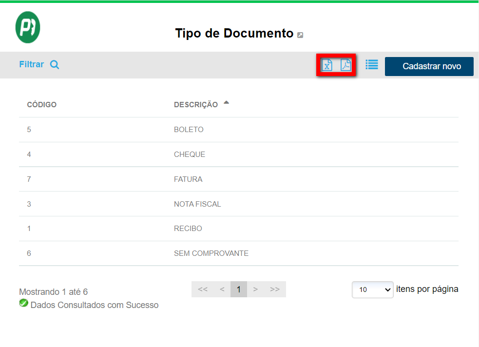 1. É possível exportar esta listagem clicando nos ícones ;