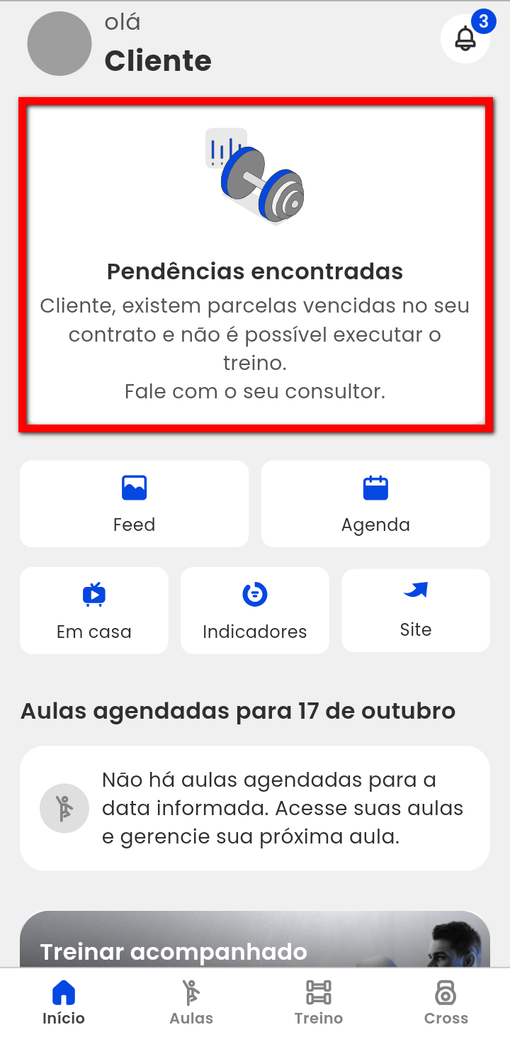 1. Assim que o aluno acessa o aplicativo na tela inicial apresenta a mensagem: "Pendências encontradas. Cliente, existem parcelas vencidas no seu contrato e não é possível executar o treino. Fale com o seu consultor."