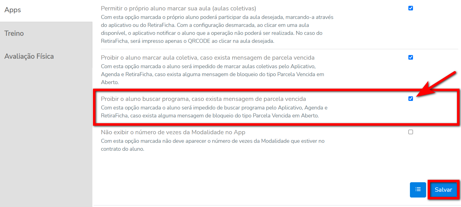 3. Localize e marque o checkbox apresentado à frente da configuração “Proibir o aluno de buscar programa, caso exista mensagem de parcela vencida”;