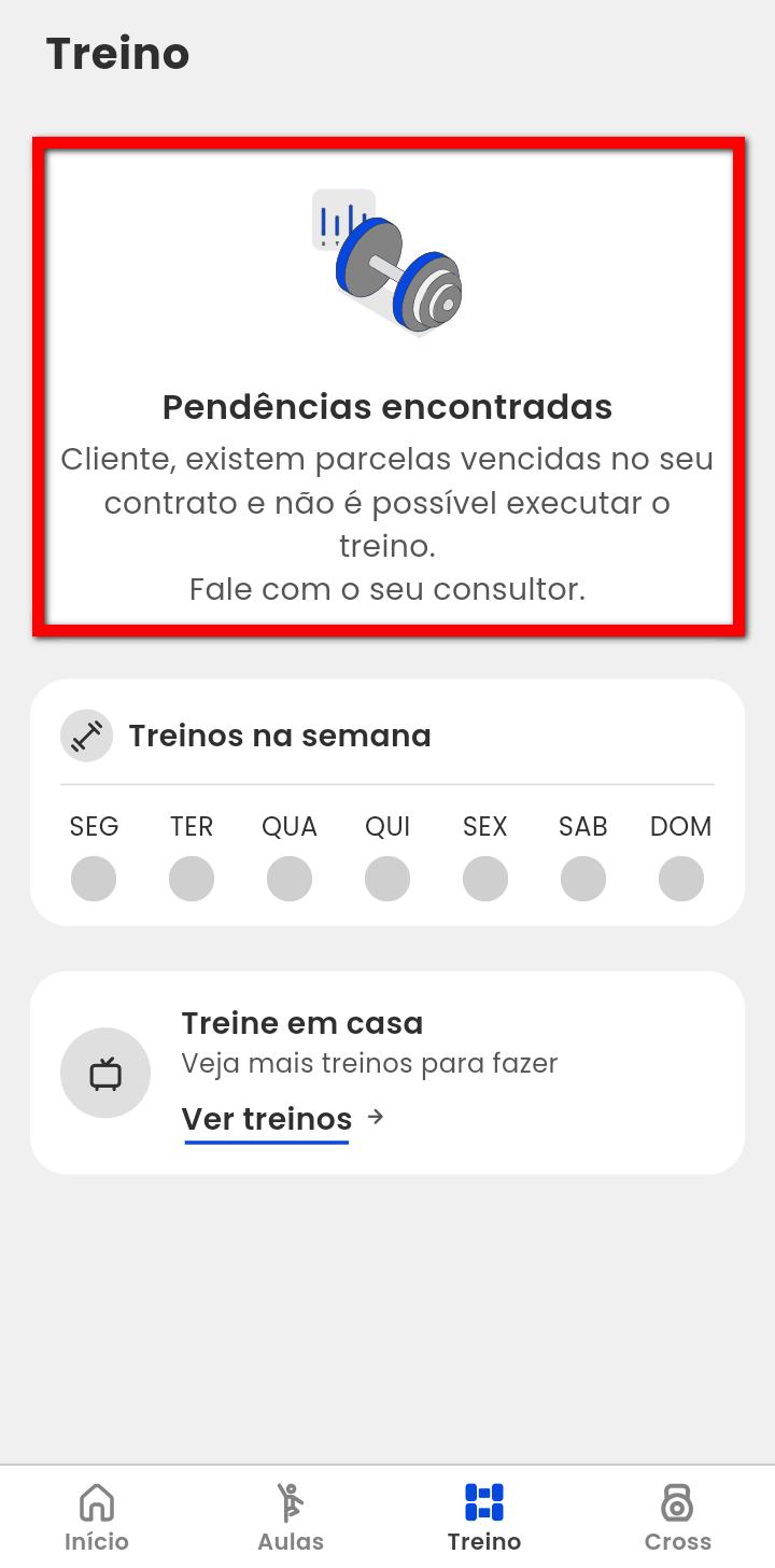 1.1. E se clicar no menu "Treino", também é apresenta a mesma mensagem. "Pendências encontradas. Cliente, existem parcelas vencidas no seu contrato e não é possível executar o treino. Fale com o seu consultor."