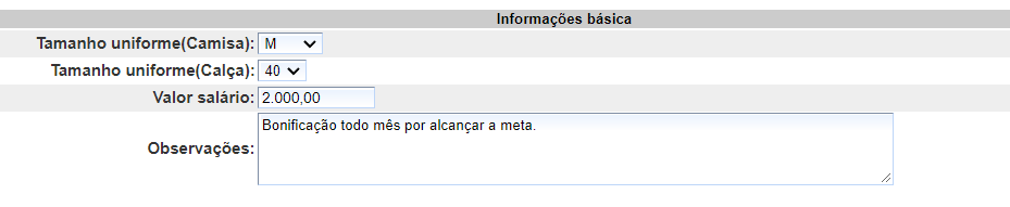 - Tamanho uniforme(Calça): informe o tamanho de medida da calça, bermuda, shorts de uniforme do colaborador; Atenção: o sistema gera automaticamente o tamanho de camisas e calças, não sendo possível cadastrar novas medidas. As medidas de camisas são PP, P, M, G, GG, XG, EG e EGG. As medidas de calças são 0, 34, 36, 38, 40, 42, 44, 46, 48, 50, 52, 54, 56, 58, 60, 62, 64, 66 e 68.