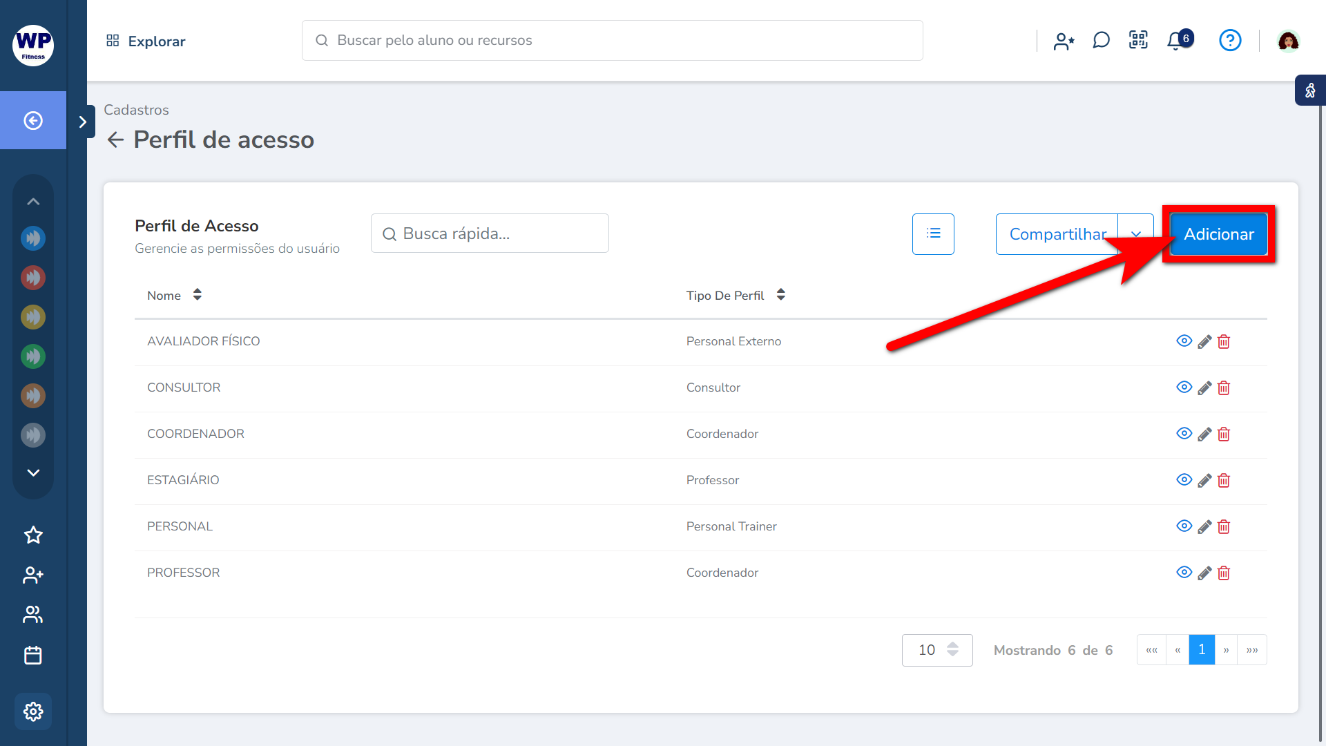 2. Logo serão apresentados os perfis de acesso do módulo treino já criados anteriormente. Para criar o perfil do estagiário clique em “Adicionar”;