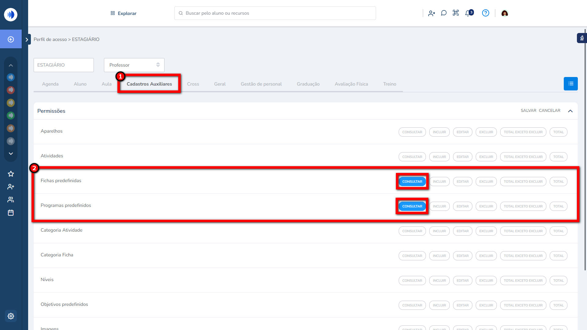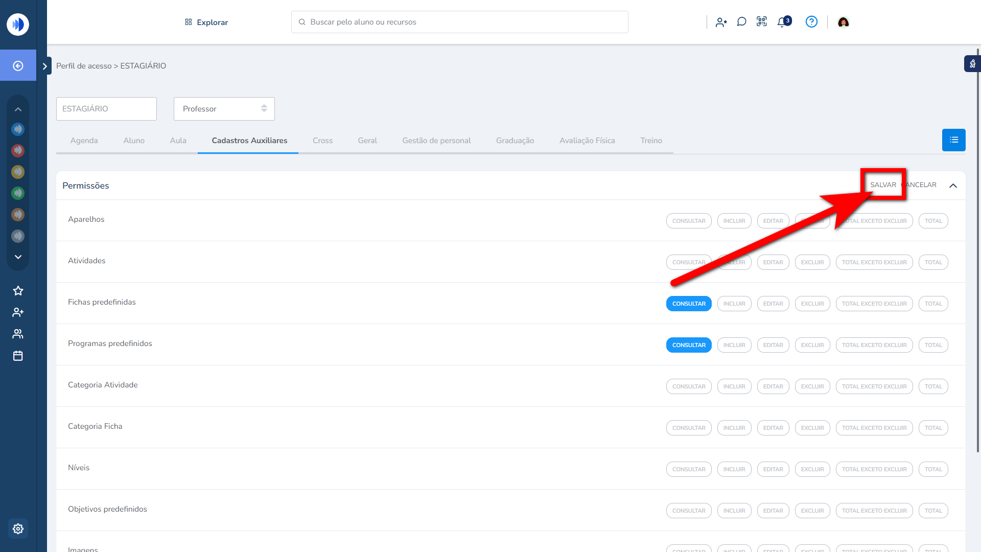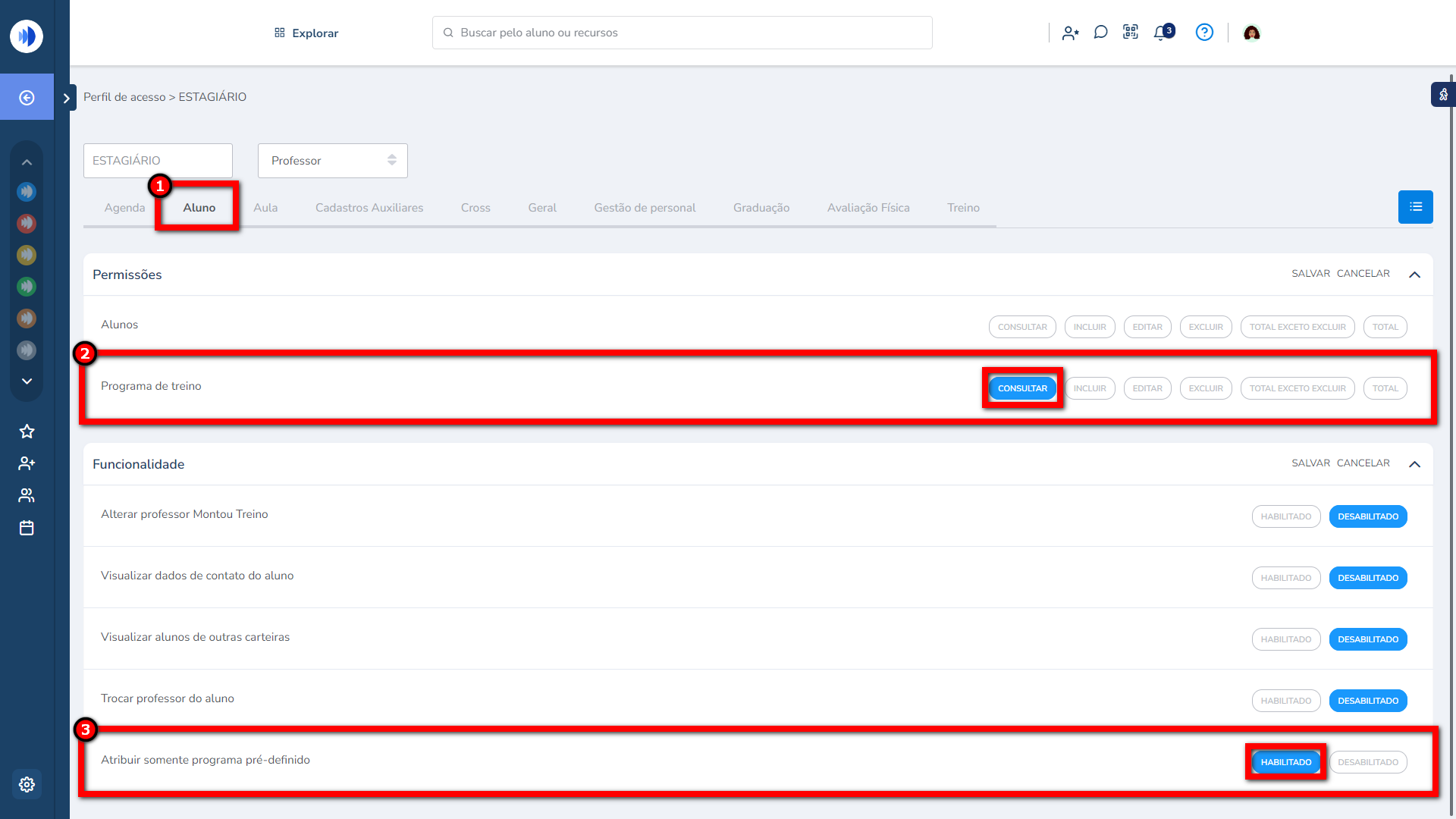 4. Para habilitar a permissão que o estagiário terá em relação aos programas de treino, primeiro deve marcar na guia “Aluno” somente “Consultar” na permissão “Programa de treino”. Após habilite a permissão “Atribuir somente programa pré-definido”;