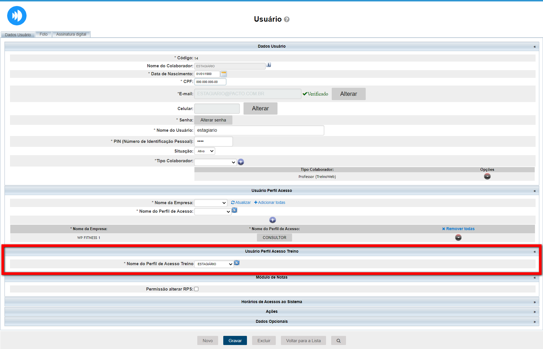 3. No bloco "Usuário Perfil Acesso Treino", selecione o perfil cadastrado anteriormente no campo "Nome do Perfil de Acesso Treino";