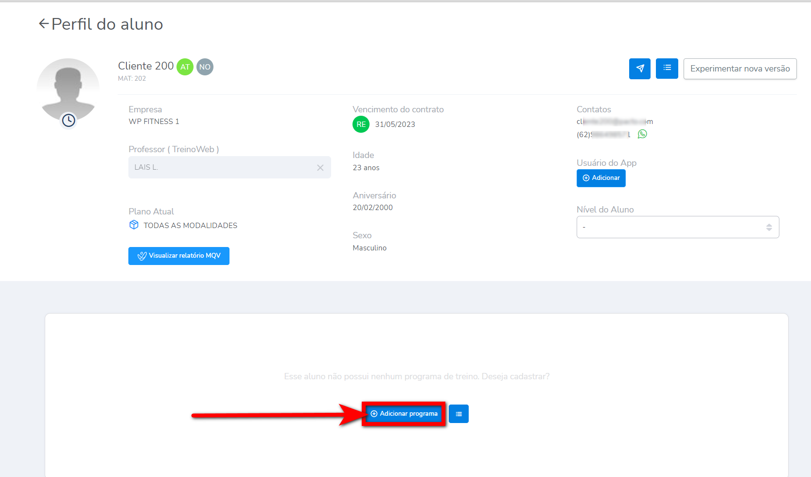1. Após acessar o perfil do aluno, localize o bloco de programas de treinos e clique em "Adicionar Programa";