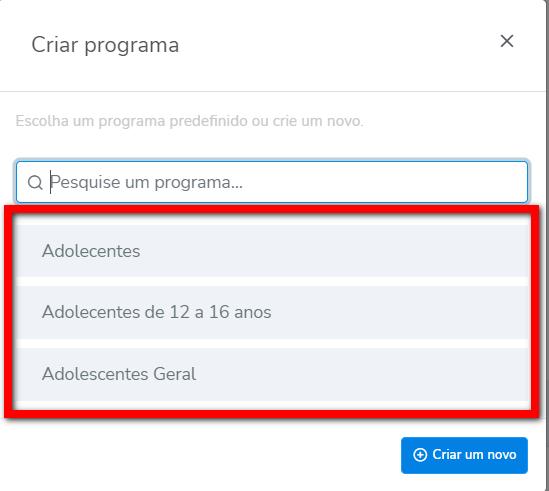 2. Será apresentada a tela com todos os programas de treino predefinidos. O estagiário irá clicar em um dos programas de treino para lançar ao aluno.