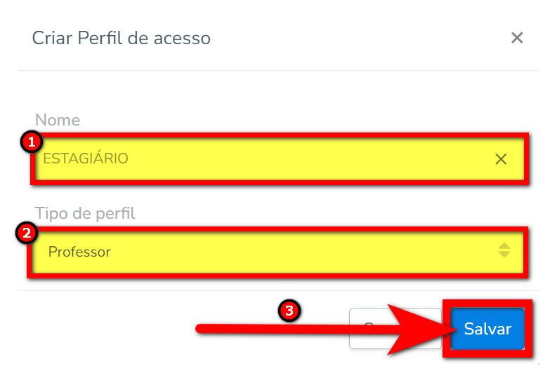 3. Informe o nome do perfil, neste caso, pode escrever "Estagiário" e selecione a que tipo de perfil esse usuário pertence. Você pode escolher "Professor". Em seguida, clique em "Salvar".