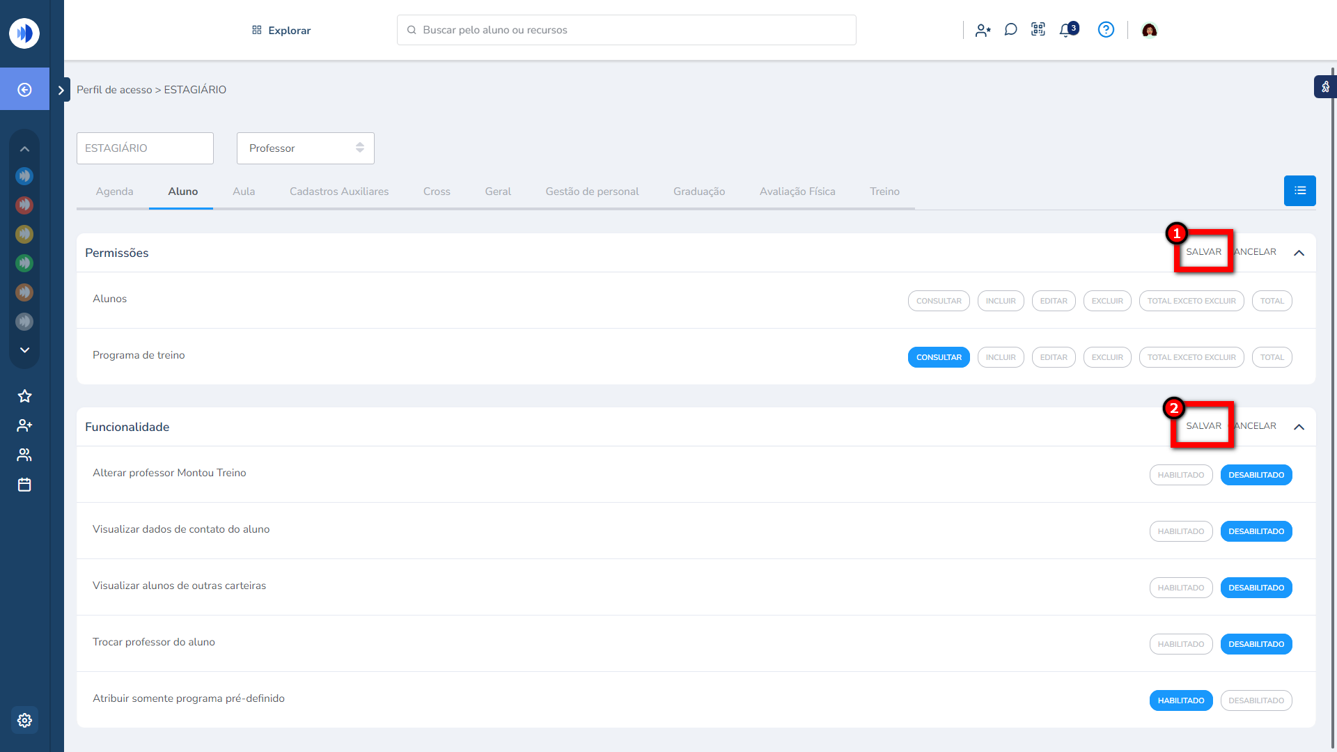 Pensando nessas empresas foi criado uma permissão no módulo Treino, onde o gestor irá criar um perfil para os estagiários e habilitar a permissão para que estes possam somente lançar os treinos predefinidos pelos Professores, não sendo possível um estagiário criar um novo programa de treino para o aluno.