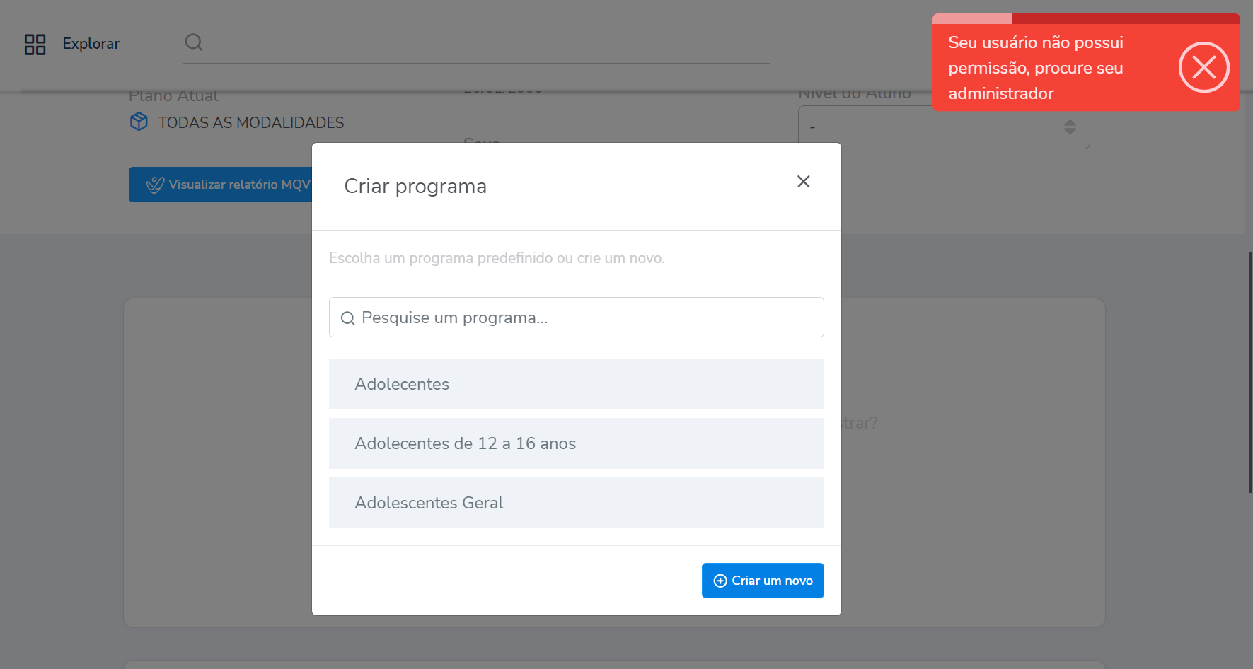 2.1. Caso o estagiário clique em “Criar um novo” o sistema apresentará uma mensagem informando que o usuário não tem permissão, sendo necessário solicitar ao professor ou coordenador para realizar a criação do novo programa de treino.