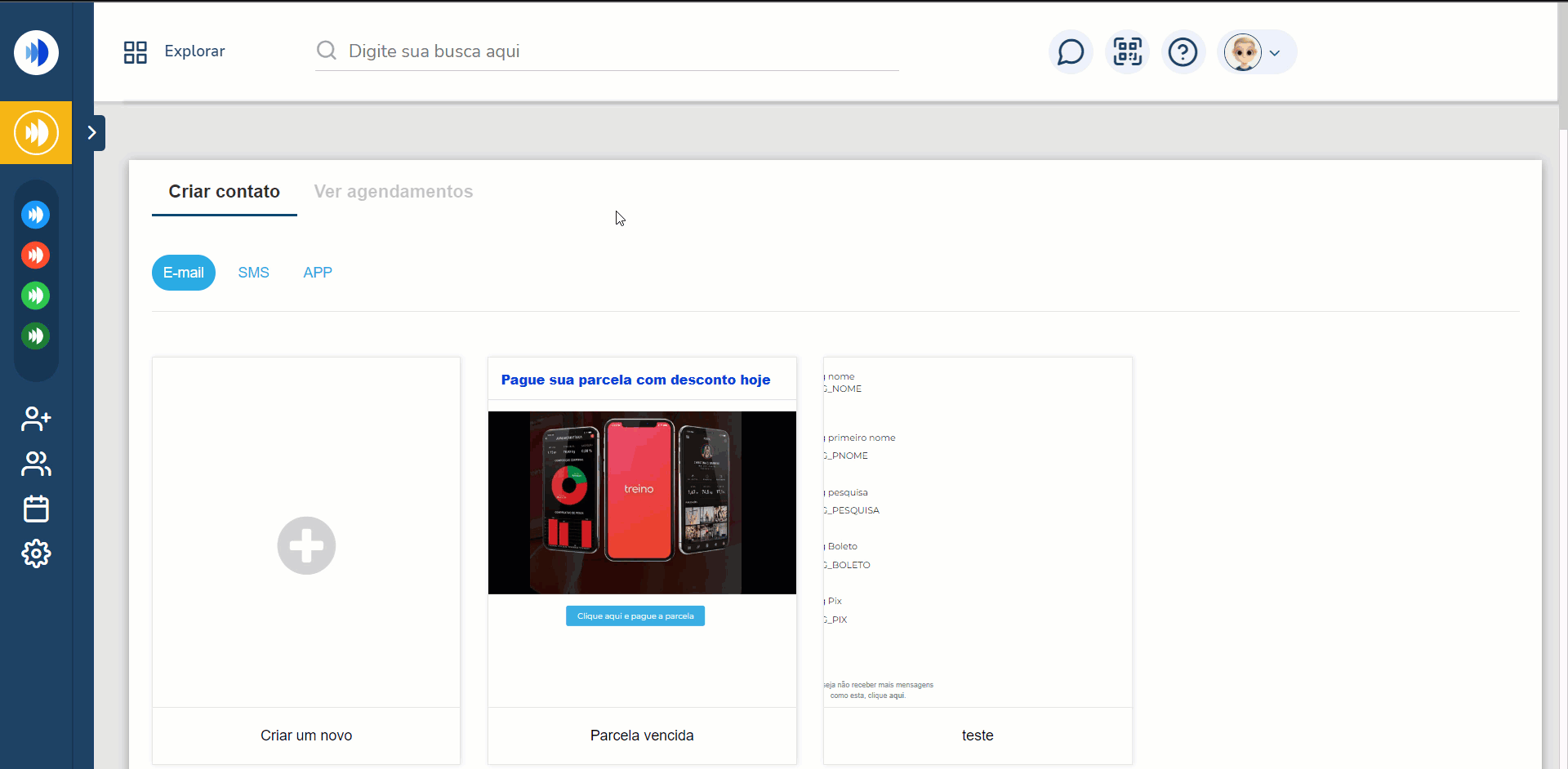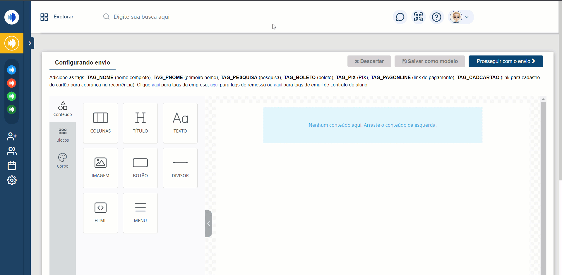 Atenção: o tipo “E-mail” possui uma maior personalização, podendo adicionar imagens, botões e textos maiores. O SMS e APP são limitados a textos e tags e possuem limite de caracteres.