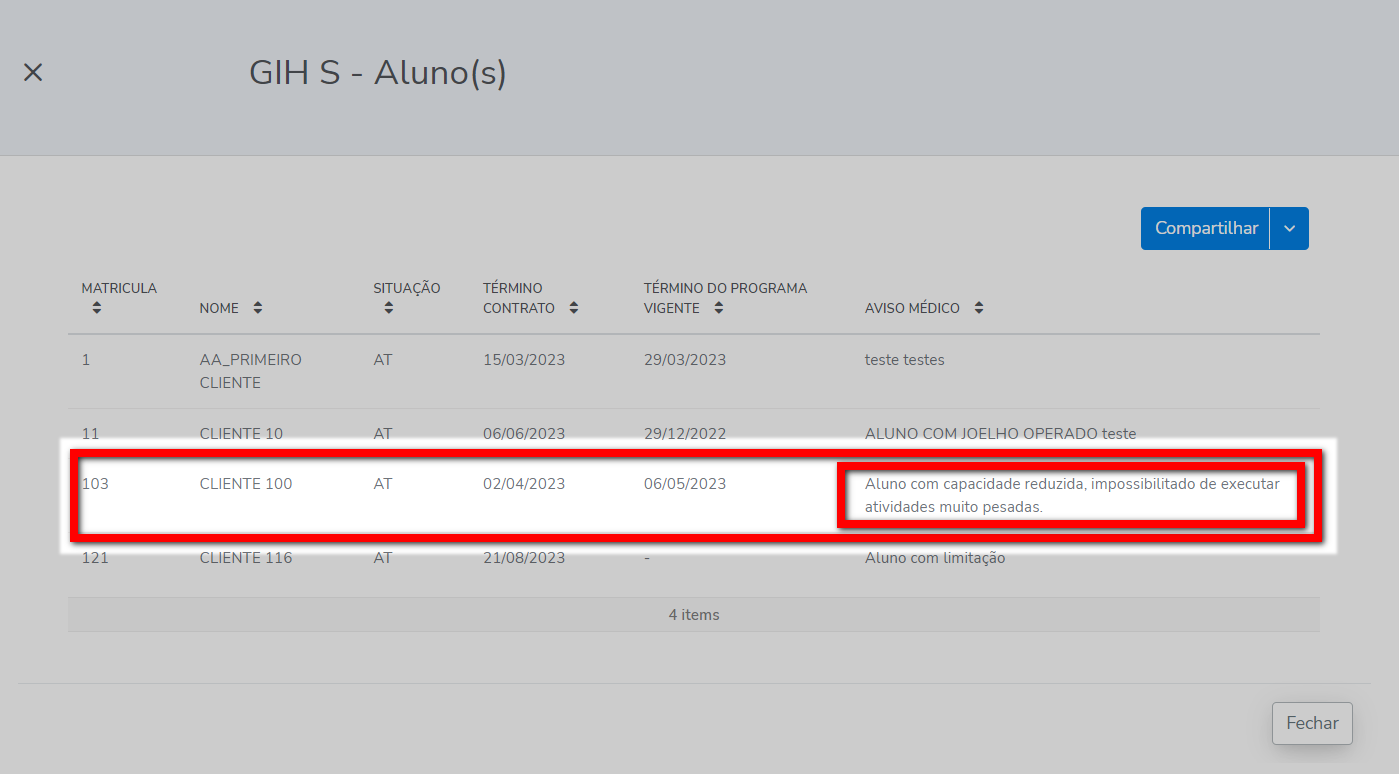 Ao realizar a impressão do treino do aluno, é possível verificar o aviso médico.