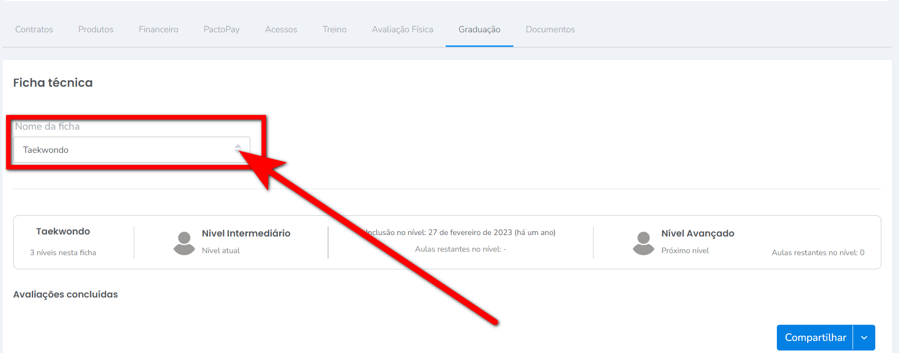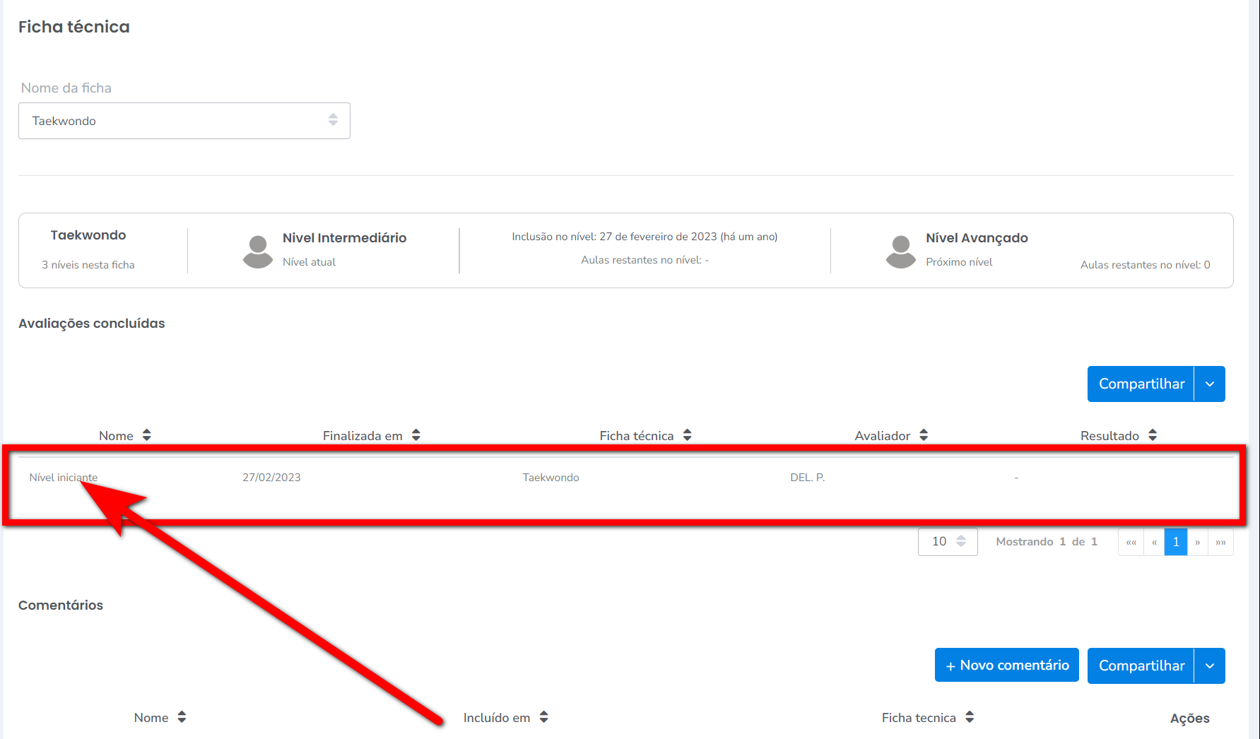 2. As avaliações estão separadas por isso deve utilizar o seletor para visualizar individualmente, e ao acessar uma das avaliações consegue visualizar as informações do Nível atual, a data que foi incluído o nível, e qual o próximo nível do aluno;