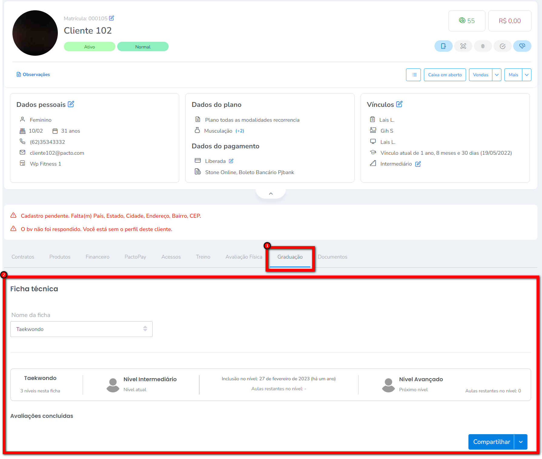 1. No perfil do aluno que deseja verificar a evolução, abaixo na guia Graduação, consegue verificar no bloco Ficha técnica todas as Avaliações de Progresso realizadas;