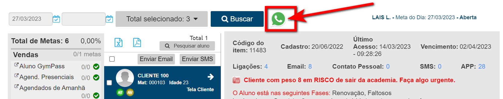2. Serão apresentadas as fases da meta diária. Para conversar com os alunos pelo WhatsApp, é necessário já ter ele conectado no computador. Após, clique no ícone ;