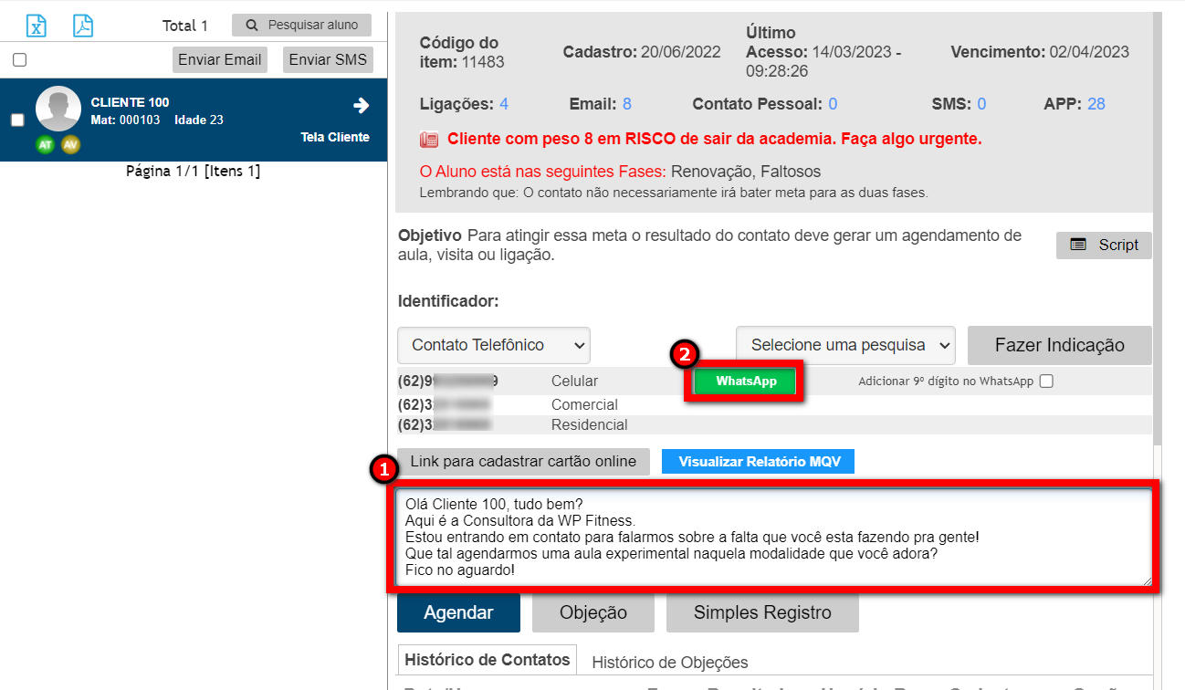 Você pode entrar em contato com seu aluno diretamente pelo WhatsApp através da meta diária.