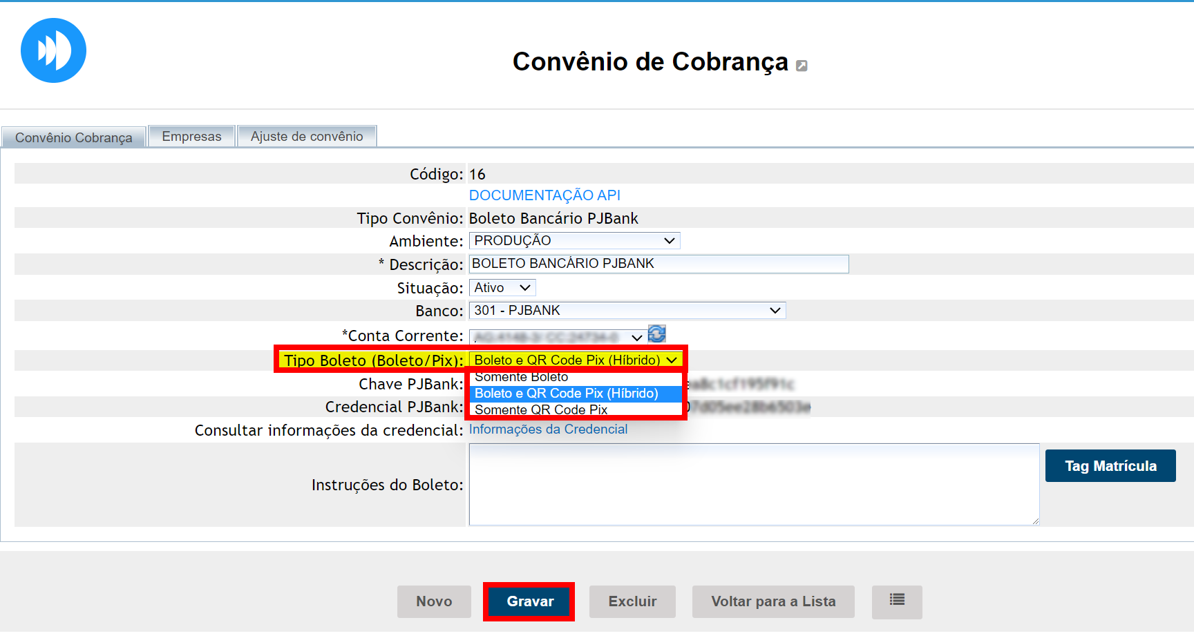 - Boleto e QR Code PIX (Híbrido): caso selecionada, o sistema irá gerar um boleto com o código de barras e o QRCode;