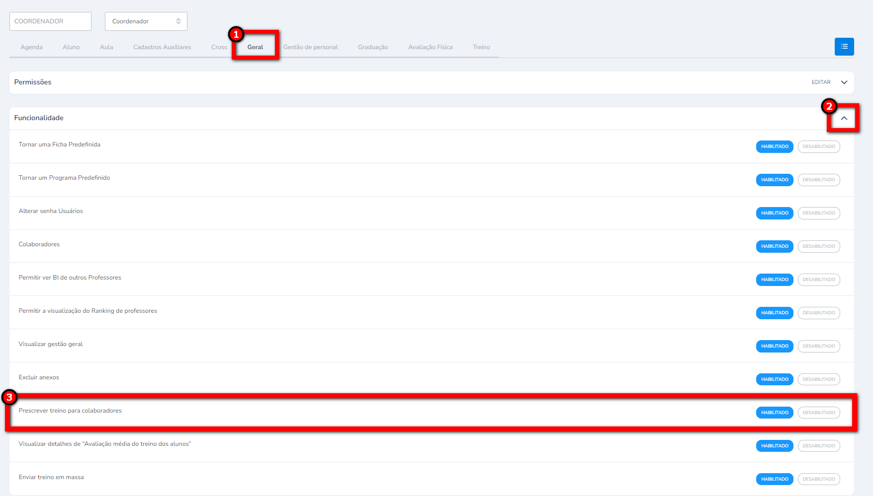3. Na guia "Geral", clique em "Funcionalidades", e habilite a permissão "Prescrever treino para colaboradores";
