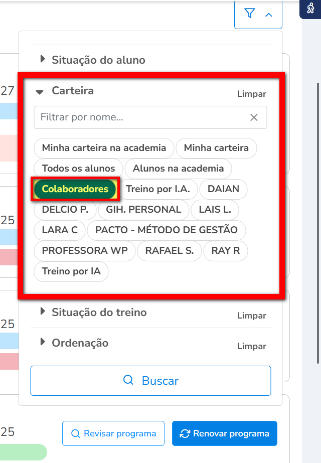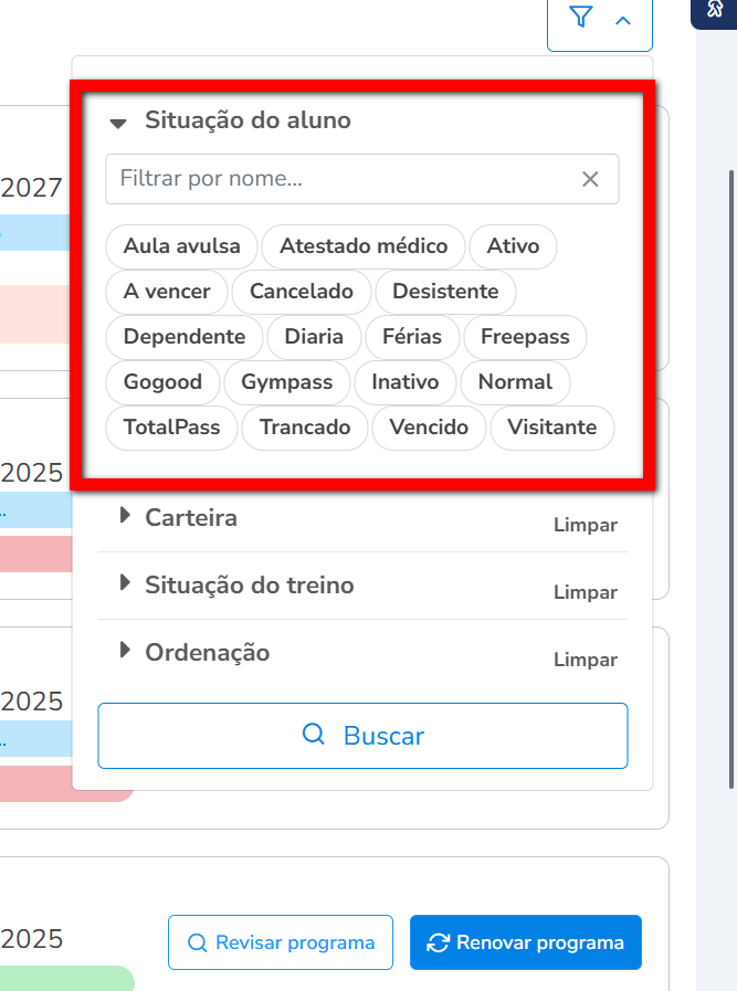 2.4. No "Situação do treino" você pode filtrar pela situação do programa de treino;