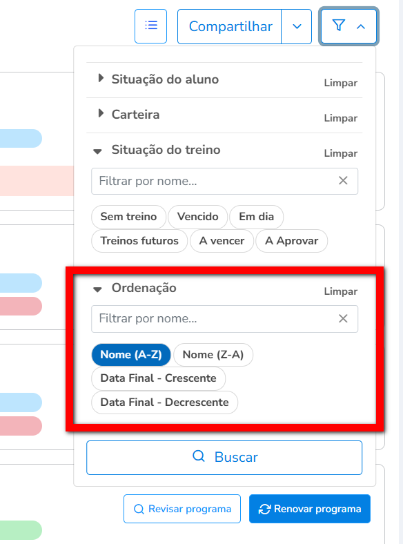 2.5. Em "Ordenação", você pode ordenar pela data de vencimento do treino ou pelo nome do aluno.