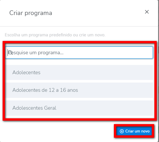 5. Ao selecionar a opção desejada, será apresentado um pop-up para prescrever o programa. Pode selecionar um programa já predefinido apresentado na listagem, ou pode criar um novo clicando em "Criar novo";