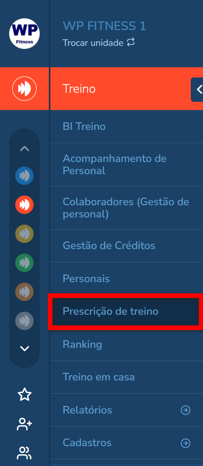 1. No menu lateral do módulo Treino, clique em "Prescrição de treino";