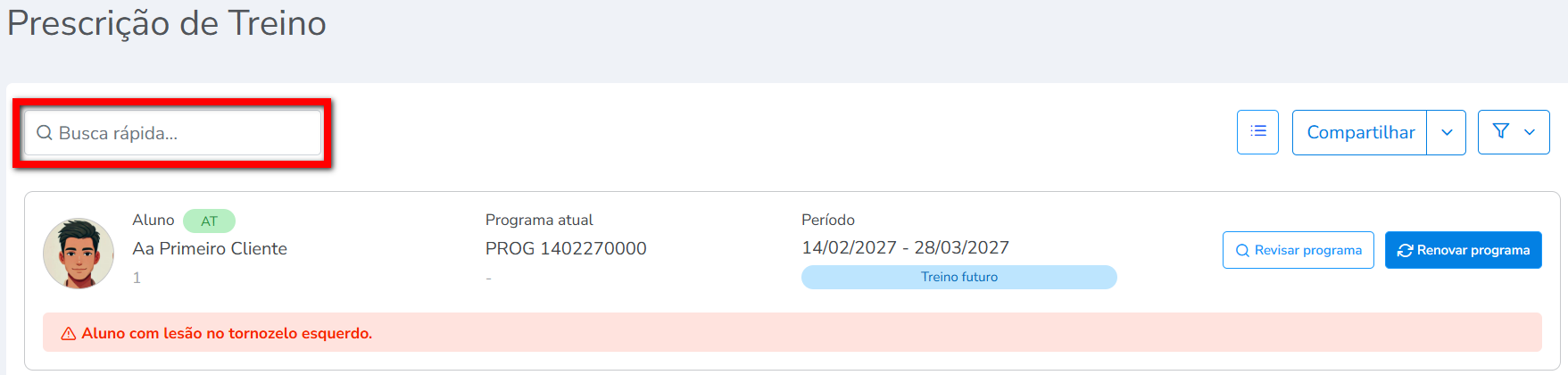 2.1. No filtro "Busca rápida", é possível pesquisar pelo nome da pessoa a qual deseja realizar a prescrição de treino;