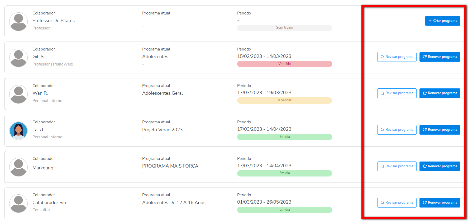 4.1. Caso a pessoa não tenha programa de treino lançado, basta clicar em "Criar programa"; 4.2. Caso o programa de treino esteja vencido, a vencer ou em dia, você pode editar o programa de treino clicando em "Revisar programa", ou pode prescrever um programa clicando em "Renovar Programa".