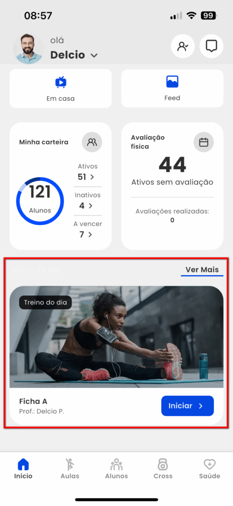 1. O colaborador logado no app Treino, no menu "Início" encontrará a sua ficha de treino do dia.