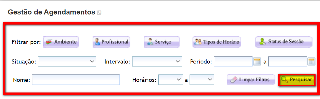 - Filtrar por: é possível filtrar os agendamentos por Ambiente, Profissional vinculado ao aluno, Serviço, Tipos de Horários ou Status de sessão. Ao clicar em um dos filtros, basta selecionar a opção desejada;