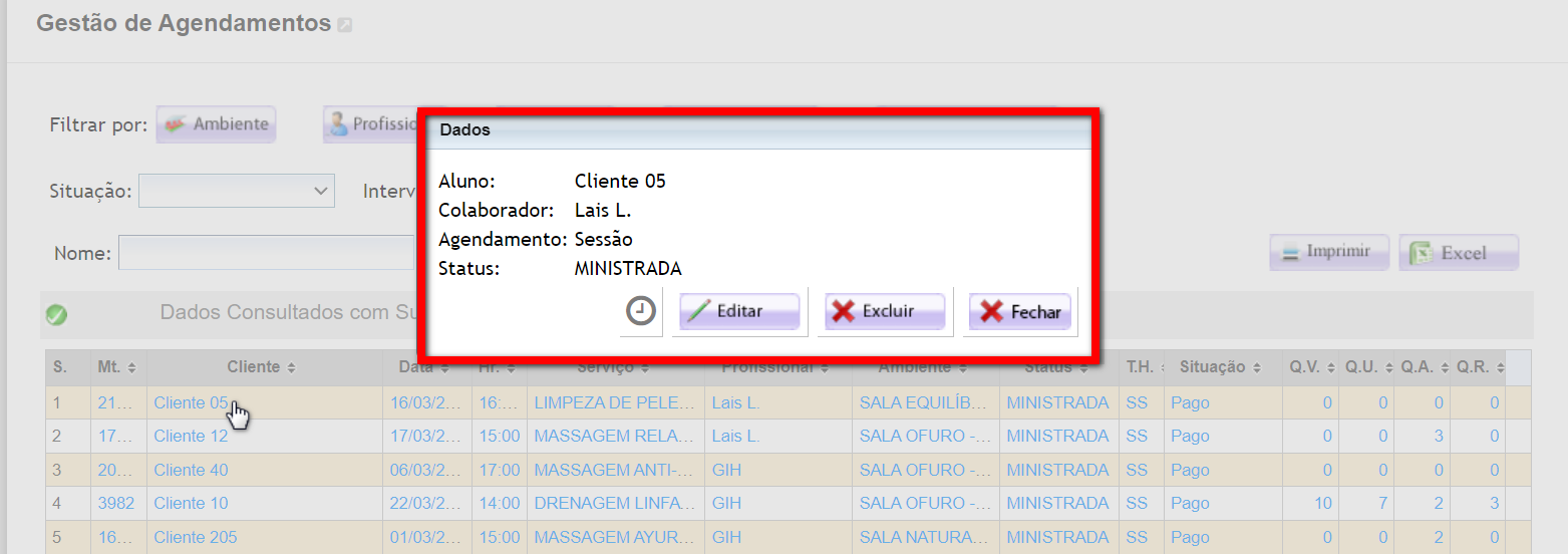 5. Caso clique sobre algum dos resultados é apresentado um pop-up com as informações do serviço agendado.