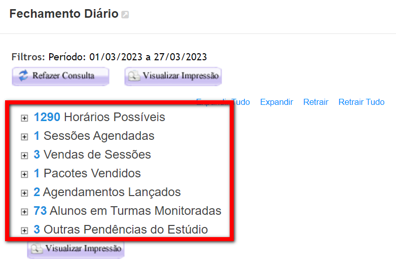 O Relatório fechamento diário foi criado para facilitar o gerenciamento das sessões, apresentando indicadores sobre vendas de sessão, turmas monitoras, pacotes vendidos e outras pendências do estúdio.