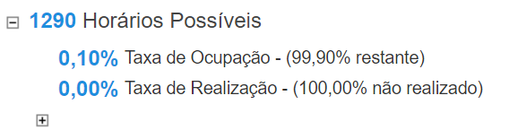 - % Taxa de Ocupação: porcentagem de ocupação desses horários possíveis, considerando o período informado. A frente apresenta a porcentagem que ainda precisa ser alcançada;