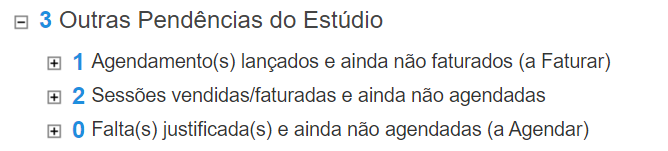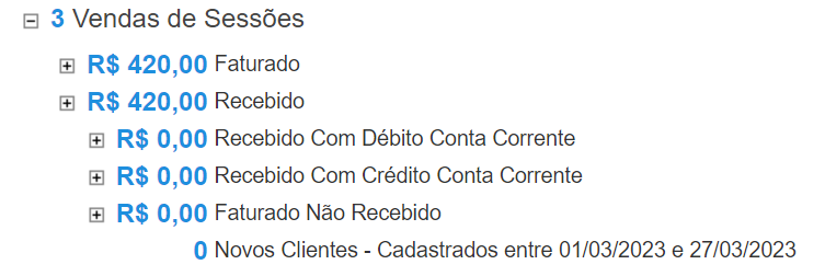 - Sessões vendidas/faturadas e ainda não agendadas: apresenta a quantidade de sessões vendidas e que ainda não possuem agendamentos realizados;