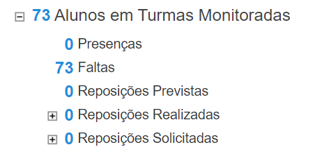 - Falta(s) justificada(s) e ainda não agendadas (a agendar): apresenta a quantidade de faltas que foram justificadas e que não foram reagendadas.