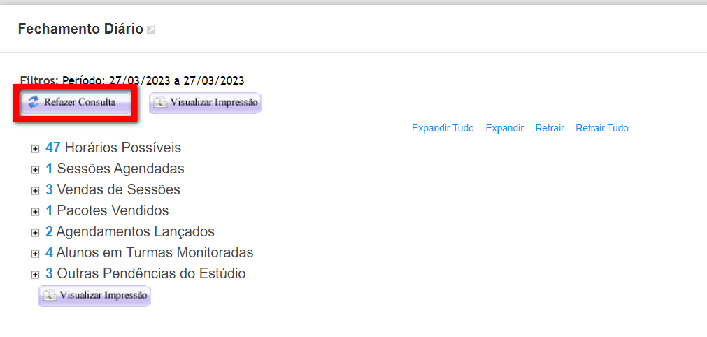 2. Logo será apresentada a tela com as informações do dia que esta acessando. Caso deseje filtrar por outros períodos clique em "Refazer Consulta";