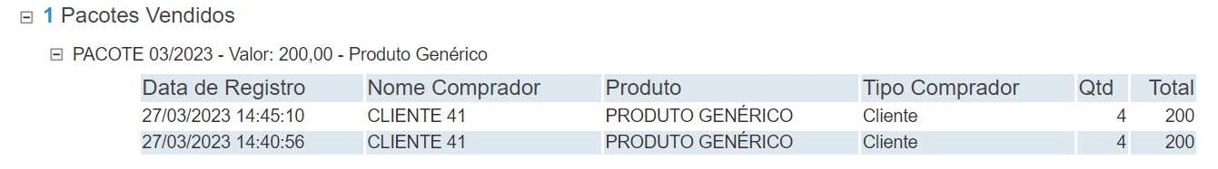 - Nome Pacote -Valor: 00,00: apresenta o título e o valor total do pacote e não o total vendido.