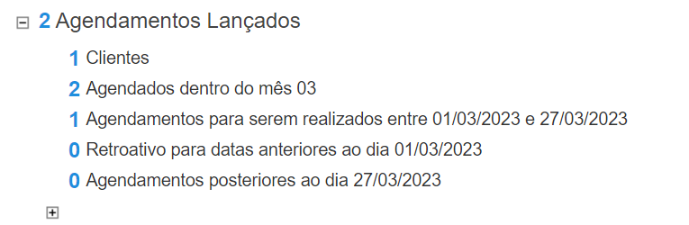- Agendamento(s) lançados e ainda não faturados (a faturar): apresenta a quantidade de agendamentos que foram lançados, porém ainda não foram recebidos;