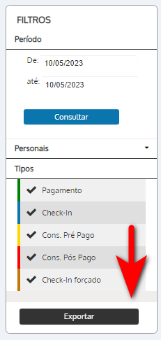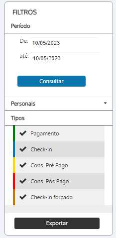 - Tipos: realize o filtro pelo tipo de evento realizado pelos personais (pagamento, check-in, check-in forçado, consumo pré-pago e consumo pós-pago);