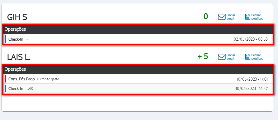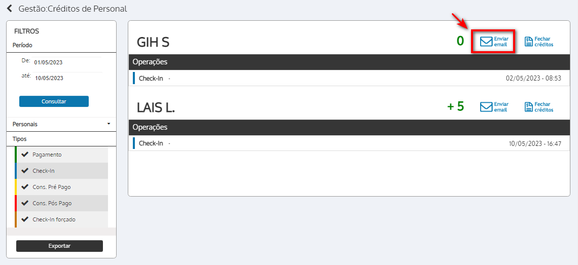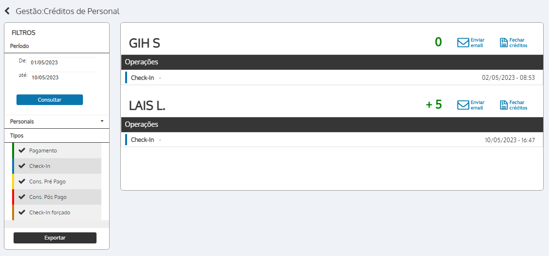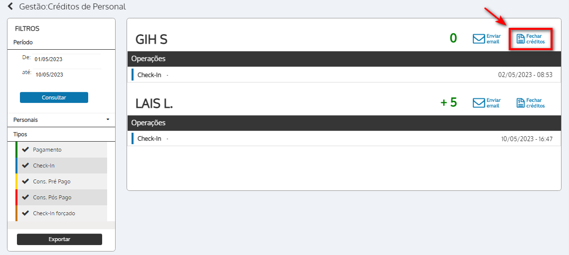 7. Para os personais que utilizam o sistema de créditos pós-pagos, pode finalizar clicando em “Fechar créditos”;