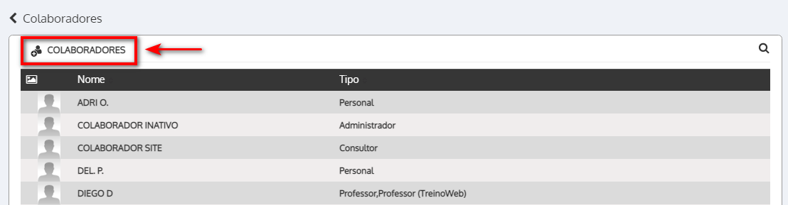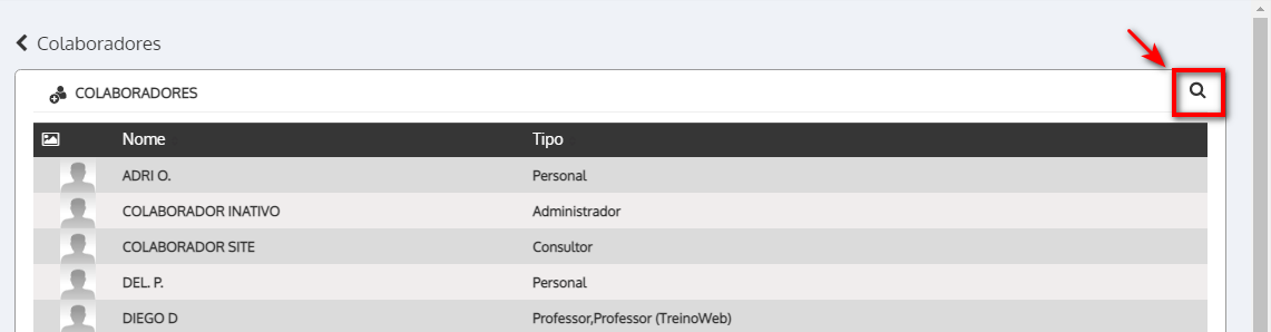 3. Para encontrar um colaborador específico, basta usar a lupa localizada acima da página;