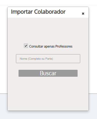 4. Se o nome do colaborador ainda não estiver disponível após o cadastro, clique no ícone (pessoa com mais) e faça a importação buscando pelo seu nome e se deseja buscar apenas pessoas cadastradas com a categoria de professor;