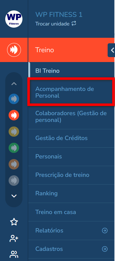 1. Acesse o módulo Treino, e no menu lateral esquerdo clique em “Acompanhamento de Personal";