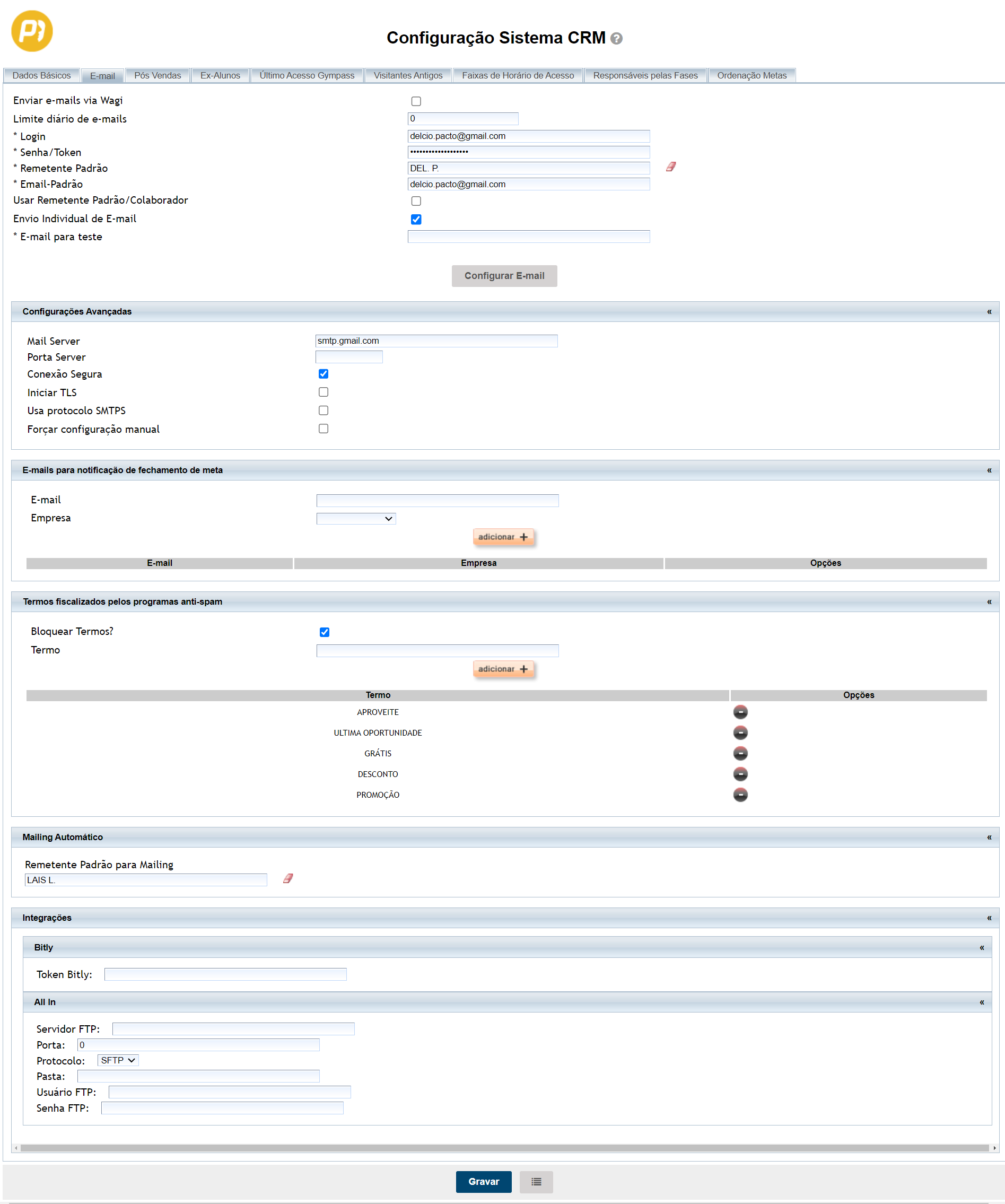 ALL IN: esta configuração de emails será usada quando você precisar fazer a configuração do envio de emails para clientes e colaboradores, através de outras ferramentas. A finalidade desse campo é configurar o endereço da caixa postal FTP do servidor do cliente no software All In. Depois configura no Maillings os critérios de lista que serão gerados, informando de arquivo que gostaria de enviar por FTP e o formato do arquivo. O sistema vai enviar para a caixa postal configurada, um arquivo com no formato escolhido com os seguintes dados dos alunos: Código do Cliente, Matrícula, Nome, Situação (AT, IN, CA, VI e et), Telefone, E-mail, Idade, Risco, Aniversário, Dias Falta, Empresa, CPF, Sexo, Endereço, Data Cadastro, Data Matrícula, Valor Mensalidade, Valor Matrícula, Plano, Modalidades, Total Acessos, Dias Acesso Semana 1, Dias Acesso Semana 2, Dias Acesso Semana 3, Dias Acesso Semana 4, Inicio Contrato, Final Contrato, Último Acesso, Convênio Cobrança, Número Contrato, Valor Parcela Vencida, Descrição Parcela Vencida, Valor Próxima Parcela, Descrição Próxima Parcela, Vencimento Próxima Parcela, Minuta do Contrato, Nome Gerente e Foto Gerente.