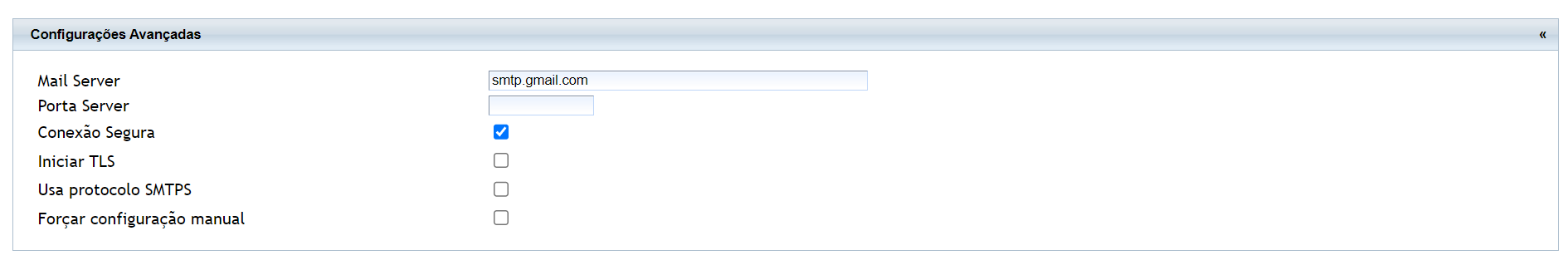 2.2. No bloco de "Configurações Avançadas", de acordo com seu servidor de email você irá realizar algumas configurações. Para saber quais são as configurações para seu servidor de e-mail, clique aqui.