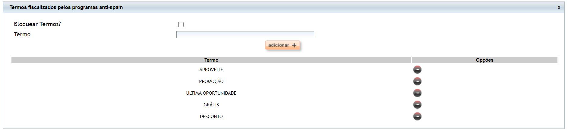 2.4. No bloco "Termos fiscalizados pelos programas anti-spam" é onde configura quais os termos que devem ser considerados como spam, e assim possibilita bloquear ou não o envio de mensagem com os termos definidos aqui.