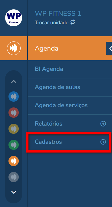 1. No menu do módulo Agenda, clique em “Cadastros“;