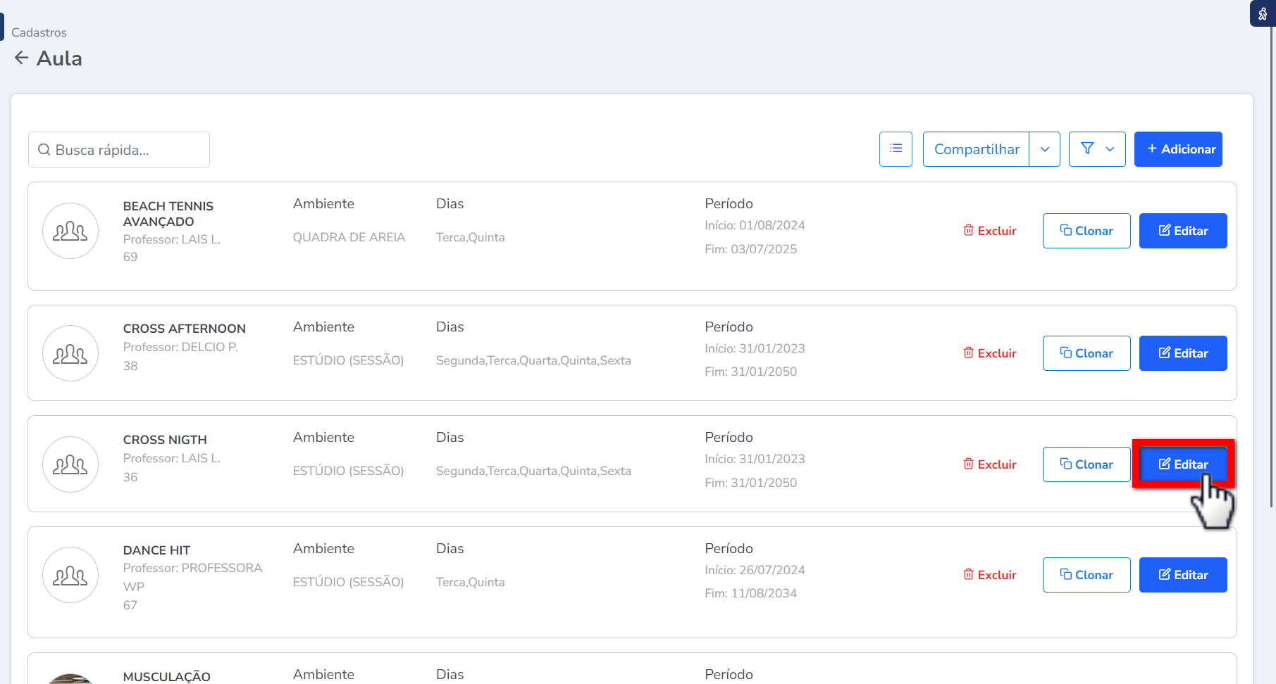 3. Será direcionado a uma nova tela onde estarão exibidas todas as aulas cadastradas. Localize a aula que deseja editar e clique em "Editar".
