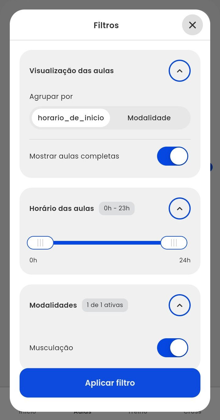 Visualização das aulas: neste bloco, é possível realizar o agrupamento das aulas por horário ou modalidade;